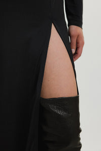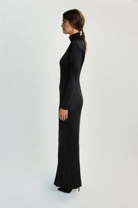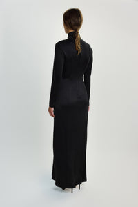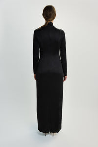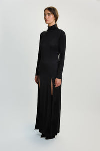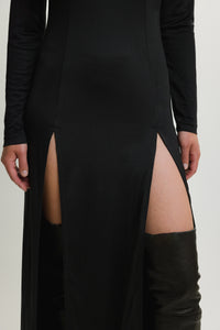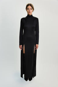 A timeless silhouette with princess-style lines gracefully guides the eyes from top to bottom, elongating and slimming the body while loosely sculpting it. The high revealing splits, combined with a collapsing turtle neck and long sleeves, strike a balanced contrast and shift the focus. This luxurious fabric fluidly activates with movement, effortlessly exuding an aura of elegance.