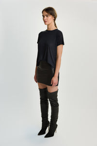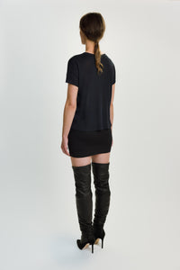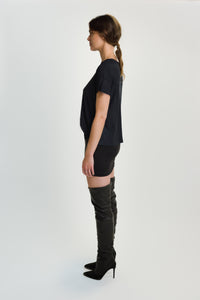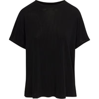 An essential biulding block to a timeless wardobe. The boxy silhoutte perfectly balanced by the fluid drape of rayon make this black crew neck tee intrinsically relaxed, yet elevated.