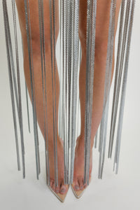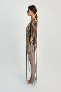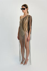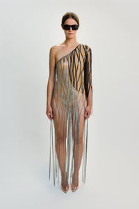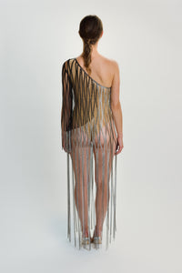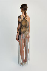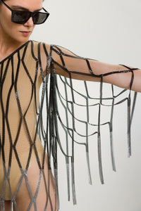 In this one-shoulder silhouette gown, we explore the nuances of negative space through the intricate patterns formed by the deconstructed material. The configuration expands and retracts with the wearer, experiencing levels of negative space as it activates with movement and matter. This piece embraces two distinct ideas within its design: one with a chainlink pattern and the other with a contrasting partial circle. Does the solid black shape embody a reinterpretation of negative space or a fragment from a larger unseen work?