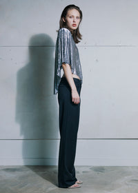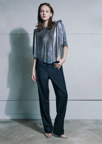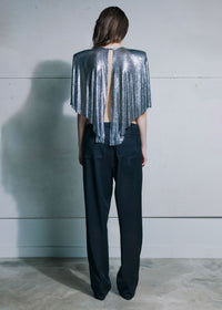 The chainmail cape balances strength and vulnerability. Strong padded shoulders meet an open back, redefining sensuality and power. A statement in contrast, it challenges conventional femininity with structure and softness.
