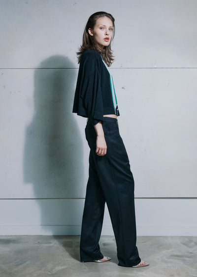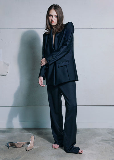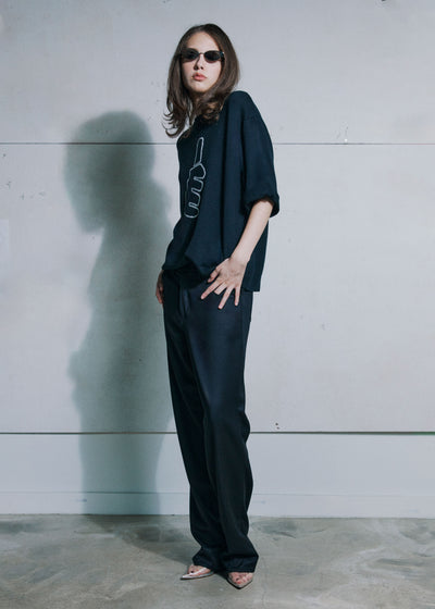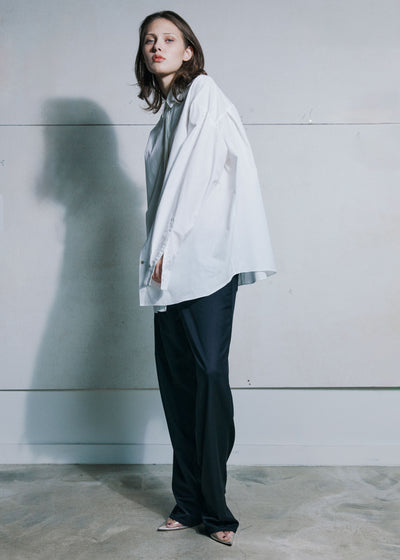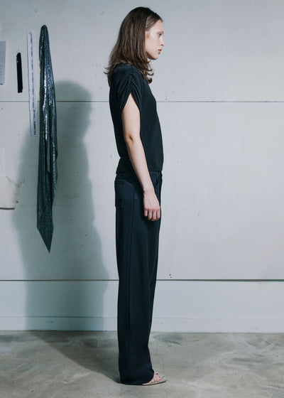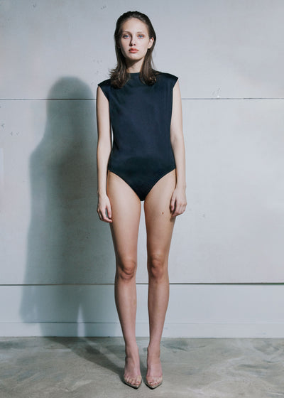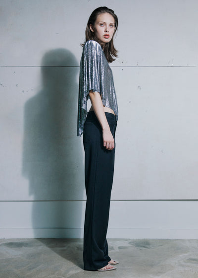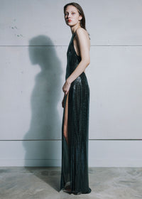 Sculpted chainmail contours the female form in this floor-length gown, featuring an ultra-high side split that balances elegance with allure. A racer back and contrasting chest pocket add subtle menswear-inspired details.