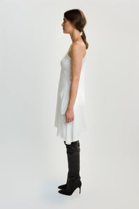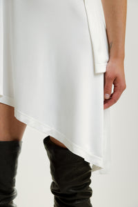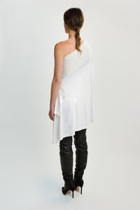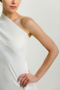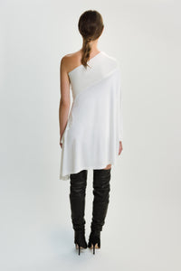 The elegant one-shoulder silhouette, enhanced by a plush cashmere band with a fluid silk body, presents a misdirection to an otherwise absurd piece. This iteration of a T-shirt dress is a playful take on a classic garment. Whimsical and chic.