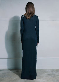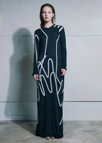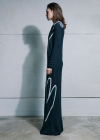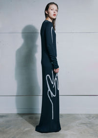 This long, column-like dress elongates the body while extending the narrative of the collection. Crafted from silk-cashmere yarn, its soft, fluid drape contrasts with the graphic wrap-around hand motif, which encapsulates the female form in various sizes and placements.