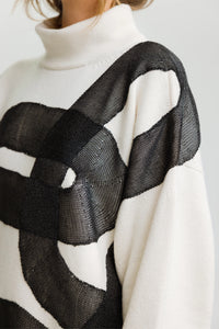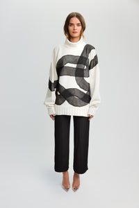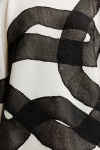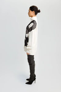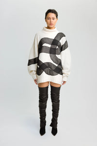 Proportionally ambiguous, this luxurious pure cashmere knitwear garment can be worn as an ultra mini dress or an oversized sweater. Inspired by mathematical knots studied in topology, the contrasting, light reflecting yarn plays with the perception of negative space and dimensionality.