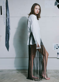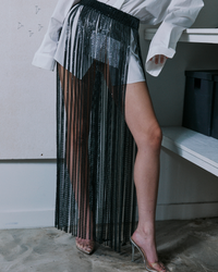 Featuring an elasticated waistband for versatility, the Little Box Skirt can be worn as a skirt or doubled as a belt. Its square contrast and sheer chainmail fringe playfully reference techniques from the Perception 002 collection. Humorously teasing the idea of modesty, it serves as more of a symbolic shield than actual protection—highlighting without truly covering, and finding empowerment in absurdity.