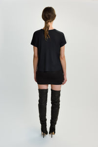 A grounding staple and timeless silhouette, our mini skirt combines supple Italian leather in the front with the ease of movement and comfort of a double knit panel in the back. This balanced pairing leaves room for different interpretations and invites personal discovery.