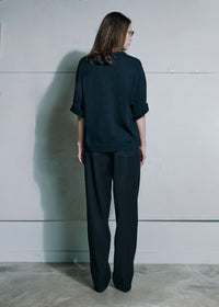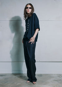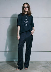 This crew neck sweater blends the luxurious feel of silk and cashmere with a relaxed, boxy fit. The thumbs-up graphic is a sharp, ironic nod to the expectations of compliance.