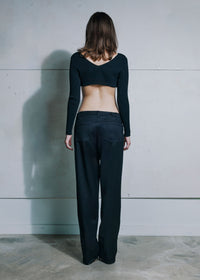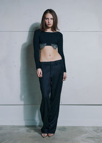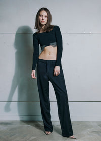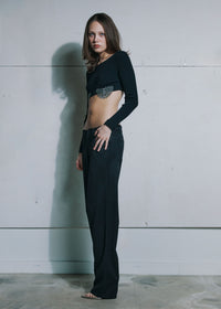 Fitted long-sleeve crop top with a front boat neck and back V-neck. The chainmail half-circles delicately frame the underbust, offering a barely-there sense of modesty. It accentuates the body, giving agency over the narrative surrounding it.